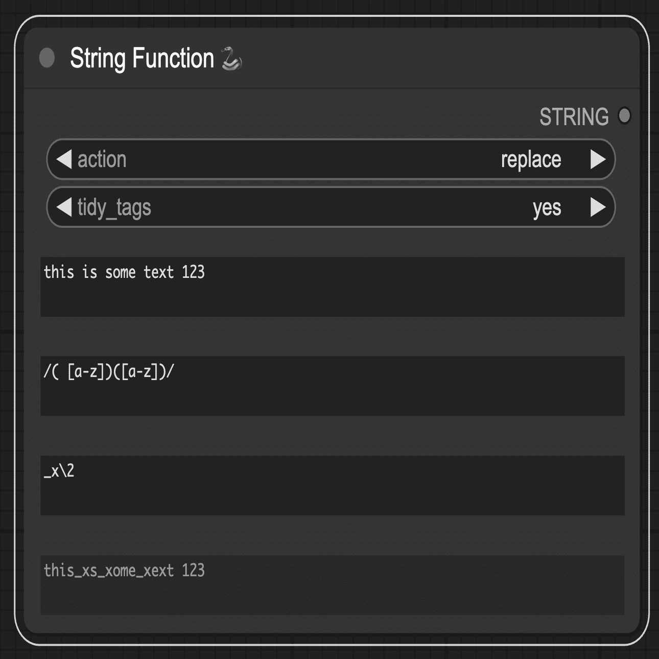 「String Function」は、テキストのカンマ区切りでの結合や、正規表現を使った置換などの機能を提供するカスタムノードです。